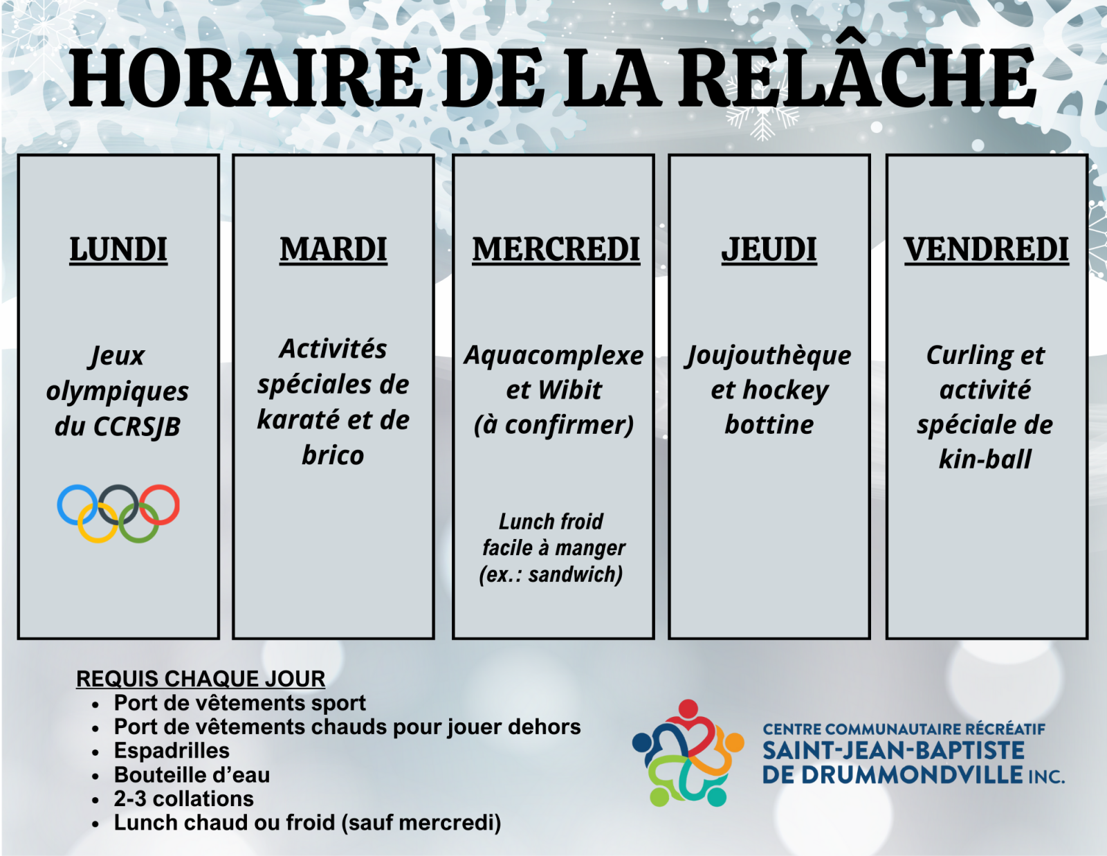 Cette année, la semaine de relâche sera synonyme de sport, d'équipe et de plaisir pour les petits comme les grands ! Venez vous amuser avec nous du 2 au 6 mars 2026 ! Au programme : Olympique du camp, brico mascotte, joujouthèque, et bien plus !